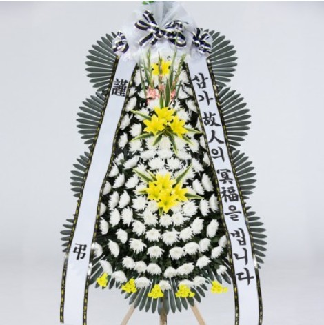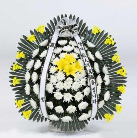 - 원형, 타원형, 또는 삼각형 구조로 배치되며, 중앙에는 흰 국화나 백합 같은 추모의 꽃이 배치됩니다.